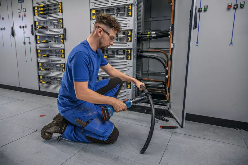 Der GKH 18V-50 schneidet ein- und mehradrige Kupfer- und Aluminiumkabel bis ∅40 mm. Ein USB-Anschluss und die kostenlose Auslesesoftware (unten zum Download verfügbar) ermöglichen die einfache Anzeige von Schnittverlauf, Fehlermeldungen und Wartungsbedarf.