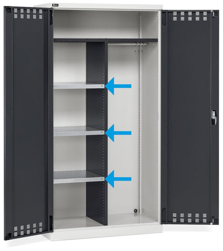 Der höhenverstellbare Schlitzboden ist ein unverzichtbares Zubehör zur Optimierung des Innenraums von Schränken mit Flügeltüren und ermöglicht die Erstellung einer modularen Struktur entsprechend den betrieblichen Anforderungen. Dieses Regal eignet sich perfekt für Werkstätten, Labore, Lager und technische Abteilungen und ist ideal für die geordnete und sichere Organisation von Werkzeugen, Geräten, Komponenten, Dokumenten und Verbrauchsmaterialien .