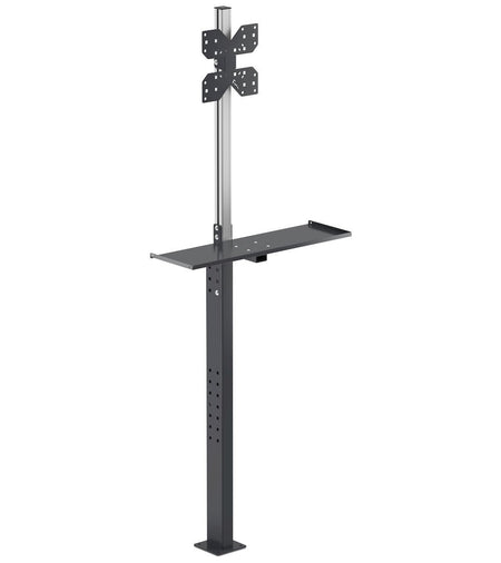 Das System besteht aus einem vertikalen, höhenverstellbaren Ständer aus eloxiertem Aluminium , der die Montage einer VESA-Platte zur sicheren Befestigung eines Monitors oder All-in-One-PCs ermöglicht. Ergänzt wird die Struktur durch eine geneigte Ablage , ideal für Tastaturen, Mäuse oder kleine Arbeitsgeräte. Die erhöhten Kanten der Ablage gewährleisten die Stabilität des Materials auch bei häufigem Gebrauch.