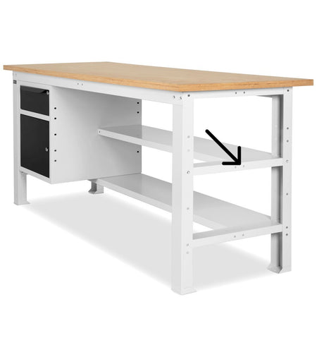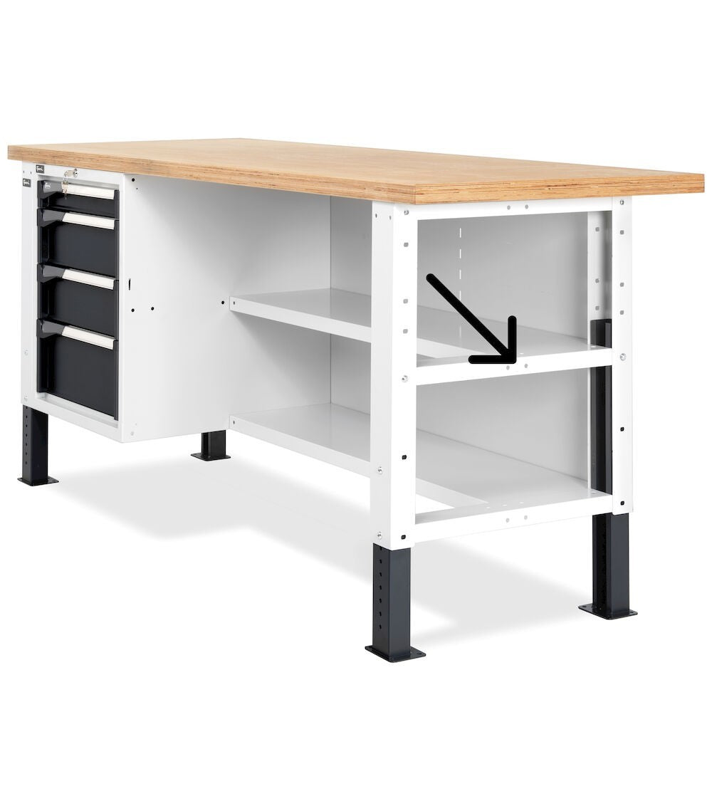 Die Stütze ermöglicht nicht nur die Installation der Halbplatte, sondern trägt auch zur Verstärkung des unteren Teils der Bank bei, wodurch diese stabiler und langlebiger wird und sich ideal für den intensiven Einsatz in Werkstätten, Laboren und Produktionsumgebungen eignet.