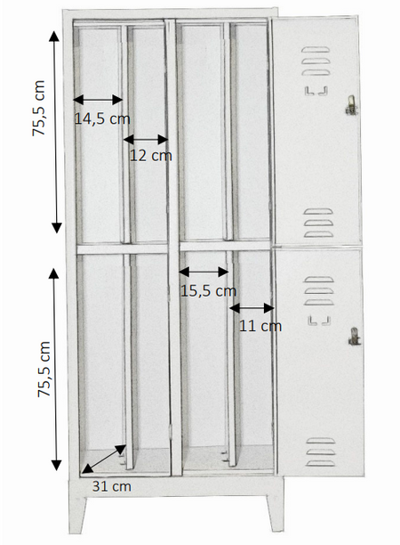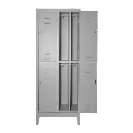 Costruito in acciaio DC01 spessore 0,6 mm, offre massima resistenza nel tempo grazie alla verniciatura a polvere epossipoliestere RAL 7035, resistente a graffi, urti e raggi UV. Le ante rinforzate includono feritoie di aerazione superiori e inferiori, porta cartellino stampato e serratura a chiave per una gestione sicura e ordinata.