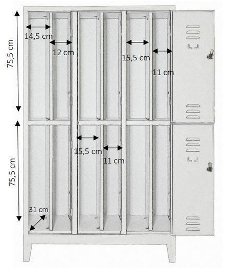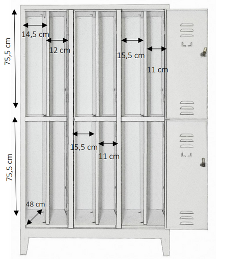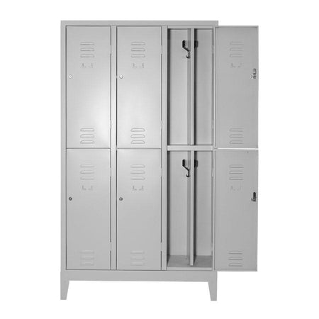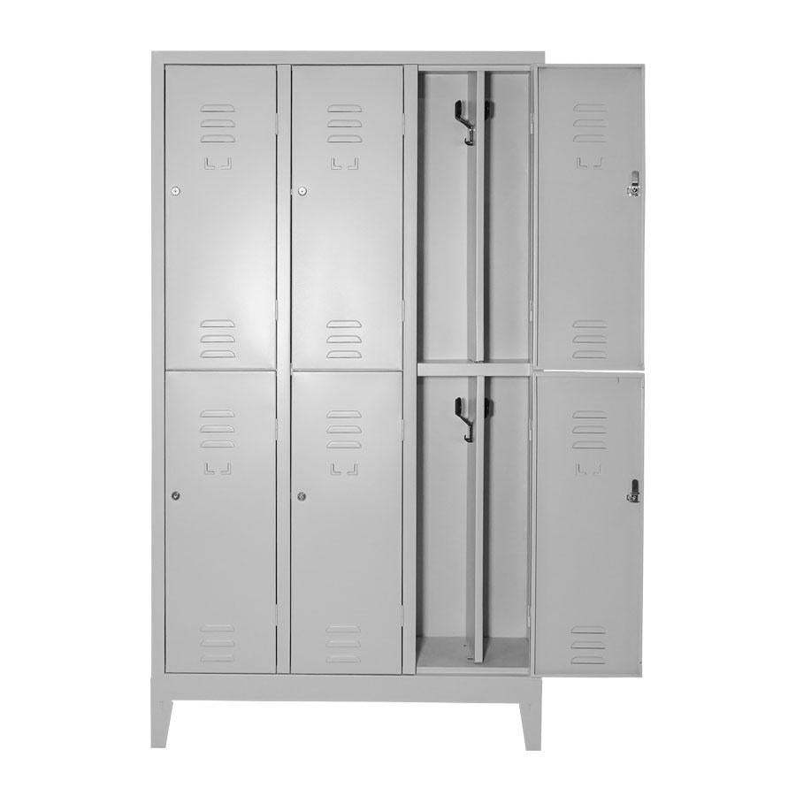Costruito in acciaio DC01 spessore 0,6 mm, offre una lunga durata nel tempo grazie alla verniciatura a polvere epossipoliestere RAL 7035, resistente ai raggi UV e agli urti. Le ante rinforzate presentano feritoie di aerazione per favorire la ventilazione, porta cartellino stampato e serratura a chiave per la sicurezza del contenuto.