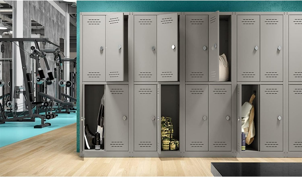Jedes Fach ist mit einem Kleiderbügel aus Kunststoff ausgestattet, der die individuelle Aufbewahrung persönlicher Gegenstände ermöglicht. Der abschließbare Griffverschluss (Vorhängeschloss nicht im Lieferumfang enthalten) ermöglicht die sichere Aufbewahrung in gemeinsam genutzten Räumen. Die gesamte Struktur ist mit hellgrauem Epoxidpulver lackiert und bietet ein widerstandsfähiges und modernes Finish.