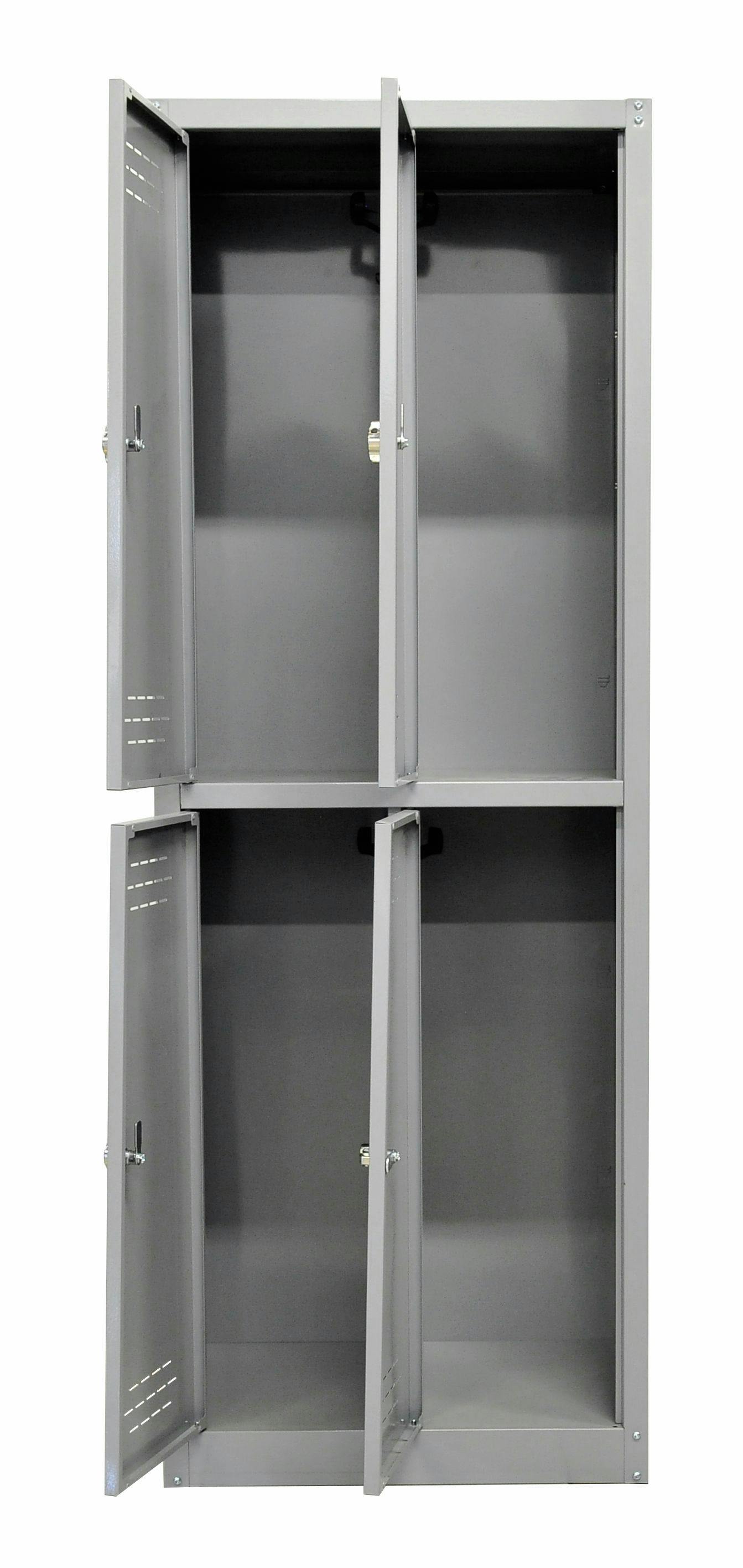 Die vier Einzeltüren verfügen über Lüftungsschlitze oben und unten, um eine optimale Belüftung zu gewährleisten und Feuchtigkeitsbildung zu vermeiden. Der 7 cm hohe Metallsockel sorgt für Stabilität und verleiht dem Schrank ein professionelles, aufgeräumtes Aussehen.