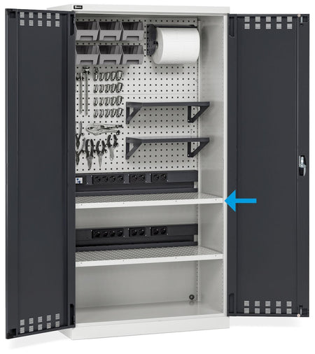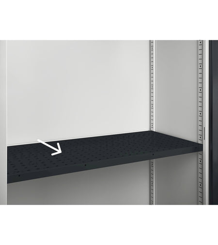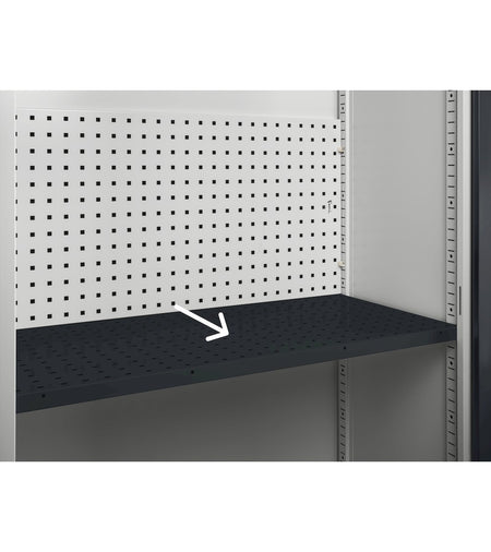 Die Lochplattenplatte ist ein äußerst vielseitiges Element und bietet bis zu drei verschiedene Einsatzmöglichkeiten in Metallschränken. Sie kann vertikal als Wandelement zur Organisation von Werkzeugen und Geräten mit Unipok- Haken und Iron Team- Zubehör installiert werden und schafft so einen aufgeräumten und funktionalen Arbeitsplatz.