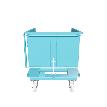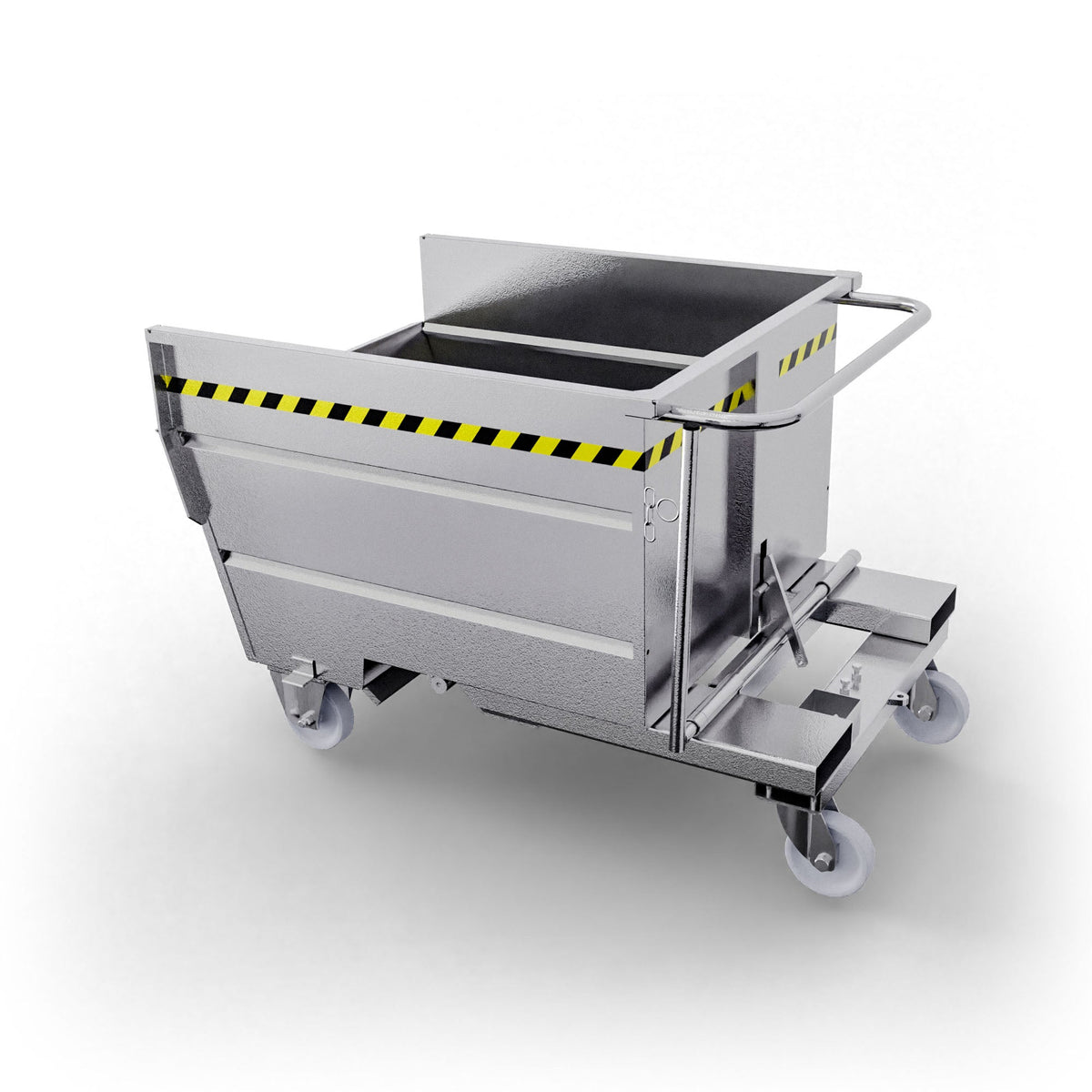 Ausgestattet mit 4 Nylonrädern (2 Bock- und 2 Lenkrollen) ermöglicht er eine schnelle Bewegung auch auf unebenen Flächen. Das hebelbetätigte Entladesystem, das mit einem Gabelstapler bedient wird, ermöglicht ein sicheres und kontrolliertes Entladen des Inhalts.