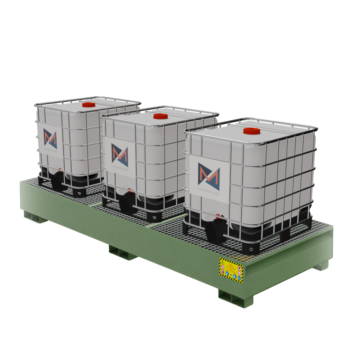 Der Mayermoover-Tank in RAL 6011 (Resedagrün) ist für die sichere Aufnahme von 3 IBC-Containern mit je 1000 Litern konzipiert und vereint strukturelle Effizienz, Haltbarkeit und eine diskrete, professionelle Ästhetik, die für jede Art von Betriebskontext geeignet ist.