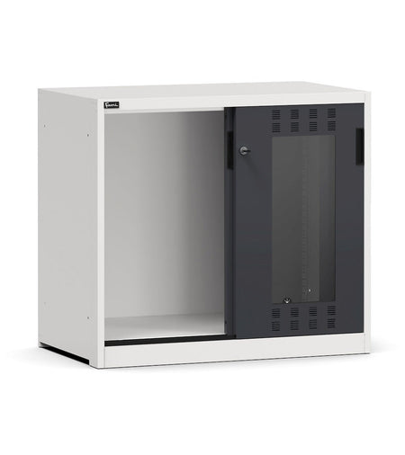 The empty cabinet with slotted sliding doors and polycarbonate inserts is a compact and highly functional solution designed for the visible and ventilated storage of materials, tools or technical components. Designed for professional environments , such as workshops, production departments and warehouses, it offers an immediate view of the contents thanks to the polycarbonate windows , without having to open the doors.
