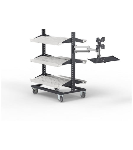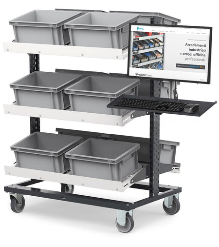 Equipped with perforated panels with a box-holding edge , the trolley allows for the orderly housing of 400x300 mm Euro Box boxes, which can be used on horizontal or inclined shelves, perfect for containing assembly kits, small parts or semi-finished products. The addition of the extendable monitor arm , with display support and inclined keyboard tray , makes it a mobile IT station suitable for use in digitalized production environments, where connection to MES software or similar systems is essential.