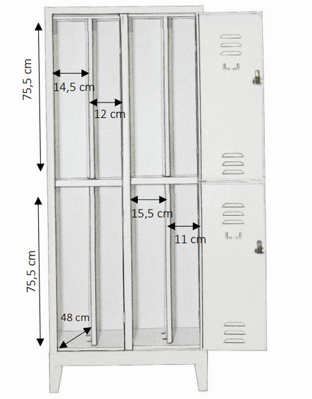 Costruito in acciaio DC01 spessore 0,6 mm, offre massima resistenza nel tempo grazie alla verniciatura a polvere epossipoliestere RAL 7035, resistente a graffi, urti e raggi UV. Le ante rinforzate includono feritoie di aerazione superiori e inferiori, porta cartellino stampato e serratura a chiave per una gestione sicura e ordinata.