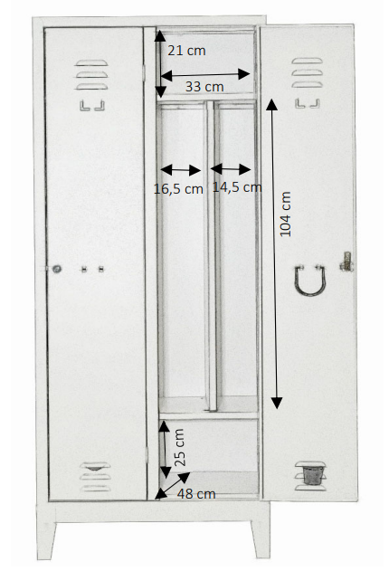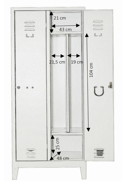 Ogni vano è dotato di pianetto superiore in lamiera con bacchetta tubolare bianca, pianetto inferiore e kit portaombrelli (anello + vaschetta raccogli gocce in plastica). Le ante a battente dispongono di feritoie di aerazione superiori e inferiori e di porta cartellino stampato; la serratura a chiave garantisce la protezione del contenuto.