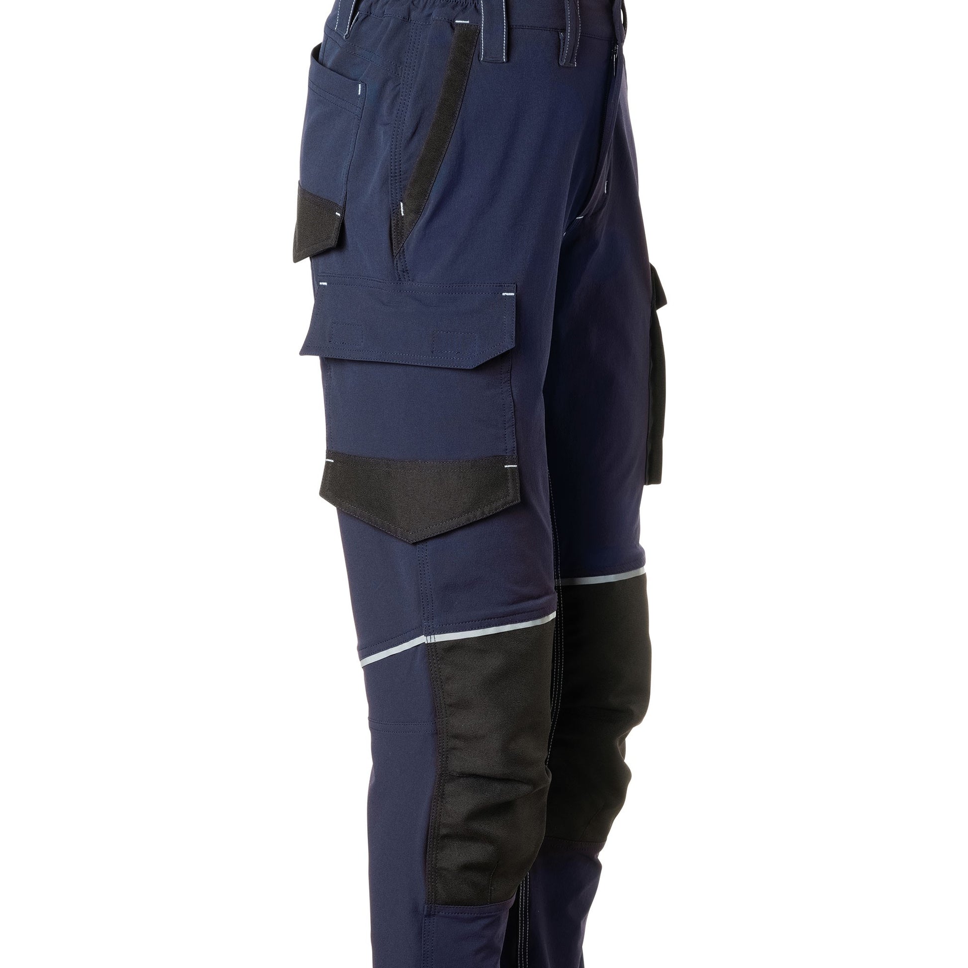 From a functional standpoint, these professional technical work trousers offer a comprehensive and streamlined pocket configuration: front and back pockets, large side pockets with flaps, and a slanted cell phone pocket on the left leg, also designed to facilitate any corporate customization . Reflective details on the knees improve operational visibility, while contrasting stitching and a reinforced crotch contribute to the garment's structural strength.