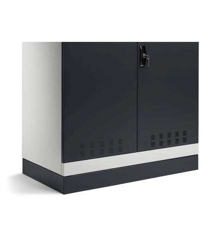 Lo zoccolo per transpallet è progettato per essere installato nella parte inferiore degli armadi metallici Perfom con ante a battente, facilitandone il sollevamento e la movimentazione tramite transpallet o carrello elevatore.