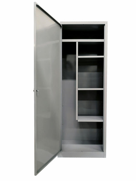 Armadio metallico monoblocco progettato per l’organizzazione ottimale di scope, detergenti e materiali per la pulizia. La struttura in acciaio verniciato, robusta e durevole, lo rende ideale per ambienti professionali, come uffici, scuole, laboratori, magazzini e locali tecnici.