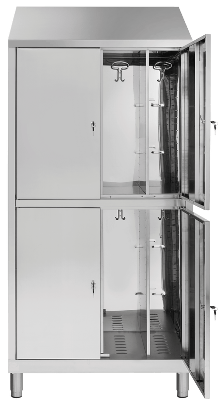 Con 4 vani sovrapposti verticalmente su una larghezza compatta di 95 cm, rappresenta una soluzione salvaspazio perfetta per spogliatoi ad alta densità d’uso. Ogni vano è indipendente e facile da sanificare, nel rispetto delle normative igienico-sanitarie.