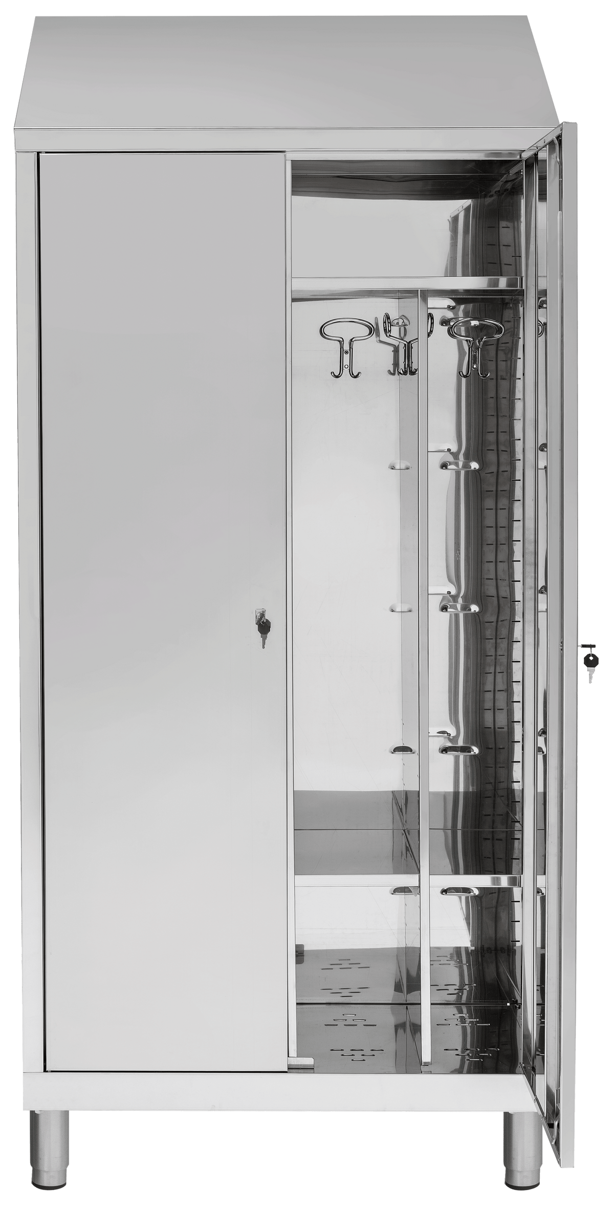 La costruzione in acciaio inox garantisce resistenza agli agenti corrosivi e facilità di sanificazione, rendendo l’armadio conforme alle normative igienico-sanitarie più severe, come quelle richieste in ambito HACCP.